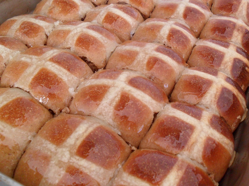hot cross buns platedEvery year on Good Friday my mother cooks up an enormous batch of hot cross buns, which are basically all devoured on the spot within minutes of leaving the oven (and some sooner than that). Warm and delicious with that sticky sugar glaze, they never last for long. When we were kids we weren’t that keen on the ones with fruit in them, so Mum kindly left it out of half of them. After a while I realised I could maximise my hot cross bun consumption by diversifying, so I’d eat the fruit-free ones until they ran out, and then branch out into the fruit ones. Eventually I came to prefer the fruit ones, but for that sugar glaze I’m happy to go either way.