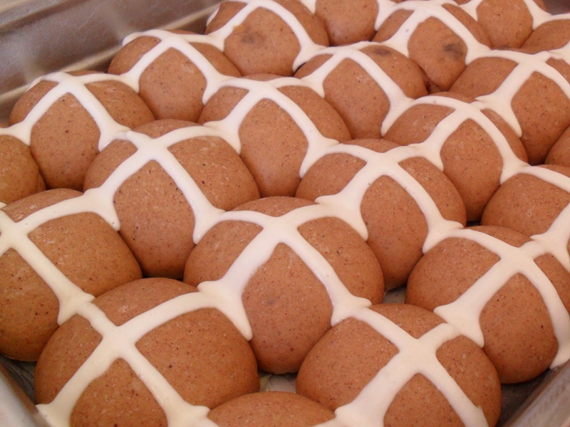 To make the crosses, mix together ½ cup flour, 2 Tbsp oil and just enough water to make a paste that can be piped, or squeezed through a plastic bag with the corner snipped. It can be quite hard to judge this, but a smooth paste is essential. (Too wet though and it won’t hold its shape once piped onto the buns.) Pipe the crosses on just before baking – do all the horizontal lines first, then all the vertical lines.